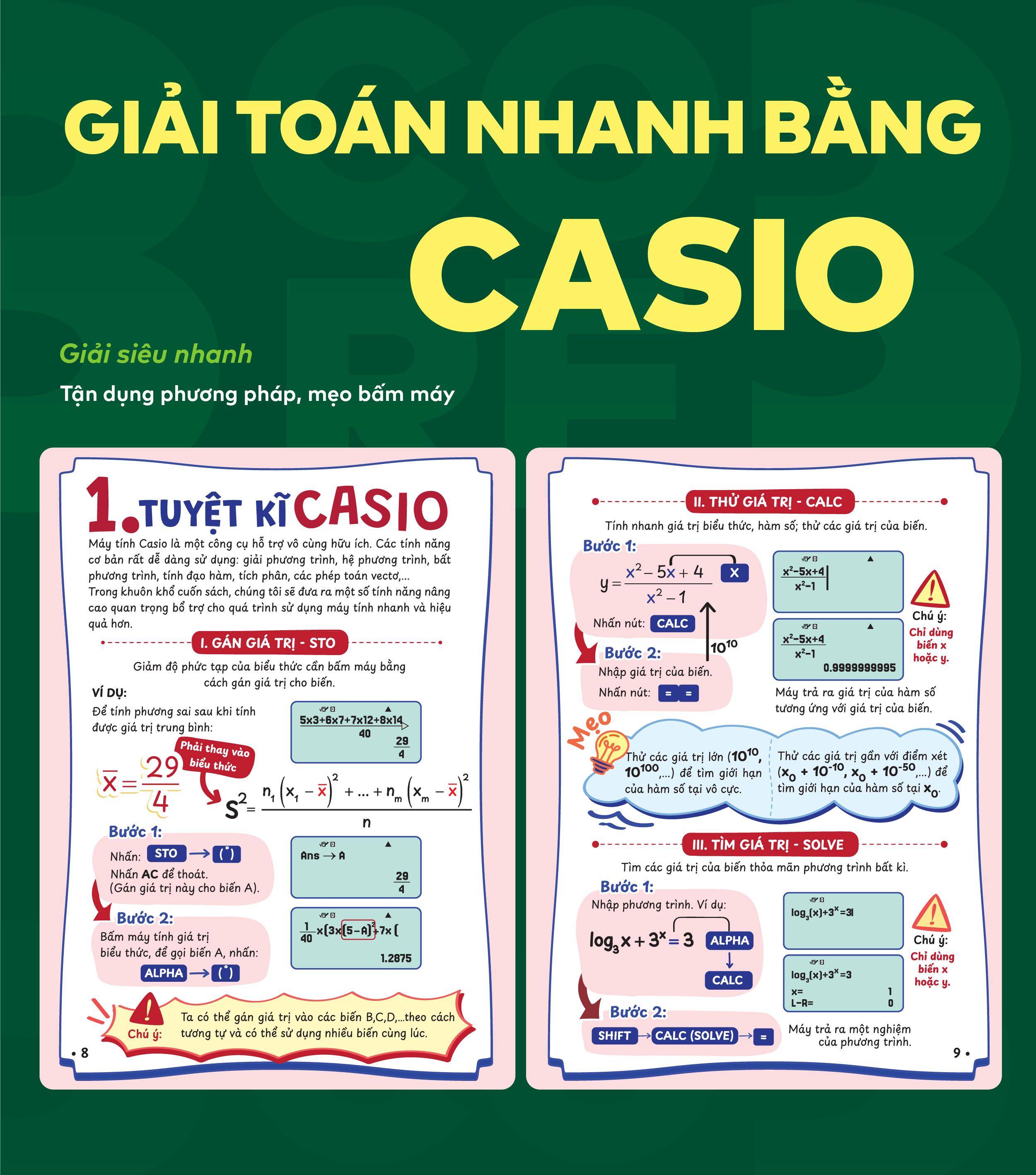 Ngay trong sách, bạn sẽ được hướng dẫn cách tận dụng Casio để rút ngắn thời gian làm bài. Những tuyệt kĩ bấm máy này không chỉ giúp bạn kiểm tra lại kết quả mà còn “cứu nguy” trong nhiều dạng toán trắc nghiệm, tăng tốc độ và độ chính xác khi làm đề.