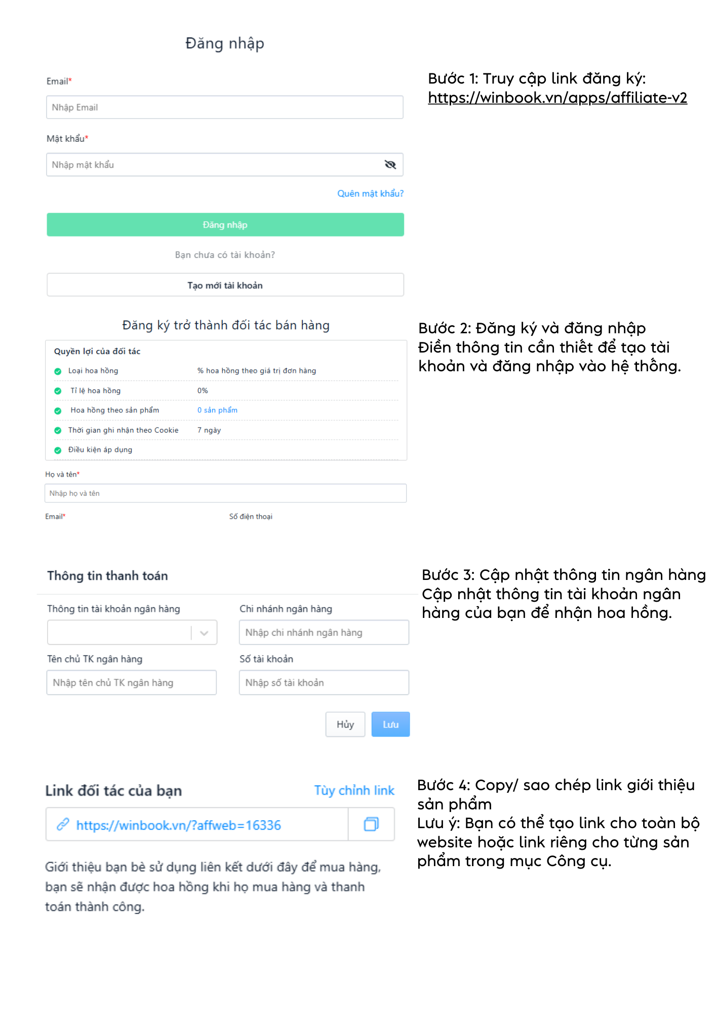 WinBook sẽ liên hệ với bạn sau khi đăng ký để ký hợp đồng hợp tác. Hàng tháng, từ ngày 1 đến ngày 10, WinBook sẽ liên hệ với bạn để ký kết biên bản nghiệm thu và thanh toán hoa hồng của tháng trước đó.